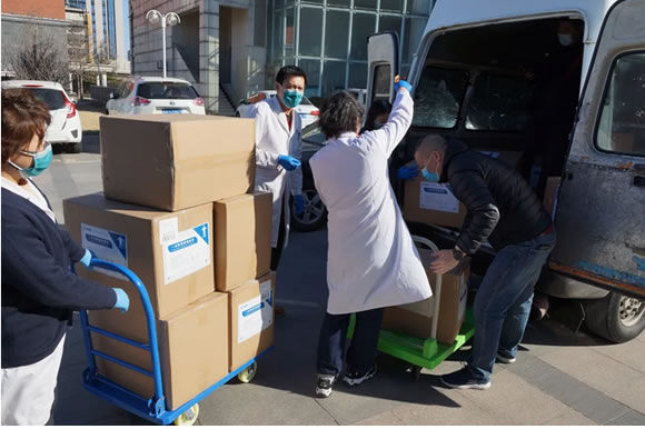 2月22日下午2:30左右,物資保障組的程國梅、竇飛、張靜、宋學鳳和薛斌幾個人一路小跑著出來卸貨——17箱850件隔離衣。這批隔離衣共10000件,已陸續(xù)抵達5150件。